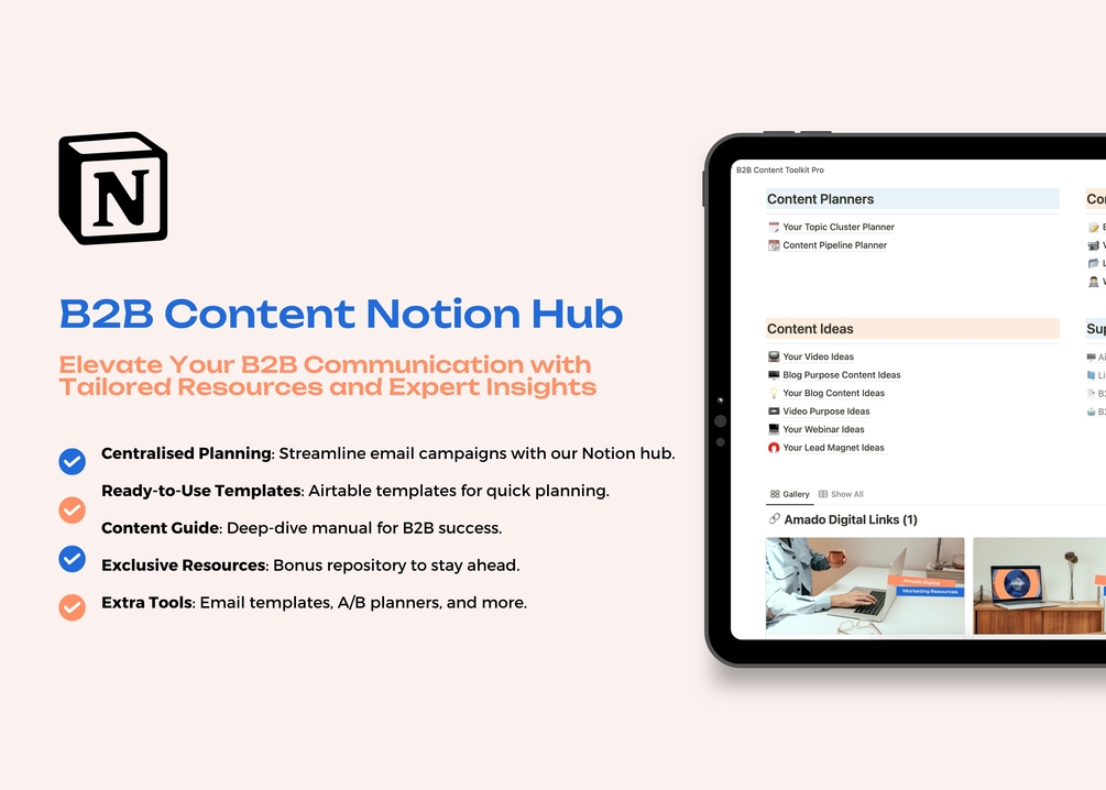 • B2B Content Planner Notion Hub: Navigate your marketing landscape with ease using this intuitive, all-in-one hub designed to streamline your B2B email campaign strategies.
