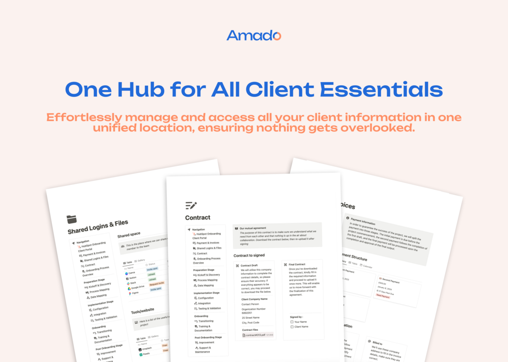 The HubSpot Onboarding Client Portal is a revolutionary Notion-based solution specifically designed for HubSpot consultants and marketing agencies. This portal serves as a comprehensive toolkit to facilitate the seamless onboarding of clients onto HubSpot, incorporating everything from the initial kickoff to post-onboarding support. By integrating critical elements such as project workflows, timelines, contracts, and shared files into one central hub, this product ensures a streamlined, transparent, and efficient client onboarding experience.
