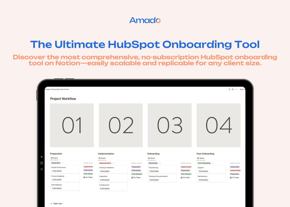 You'll get a comprehensive, streamlined HubSpot onboarding experience with tools for data mapping, training, and ongoing support, all easily shareable within your team.